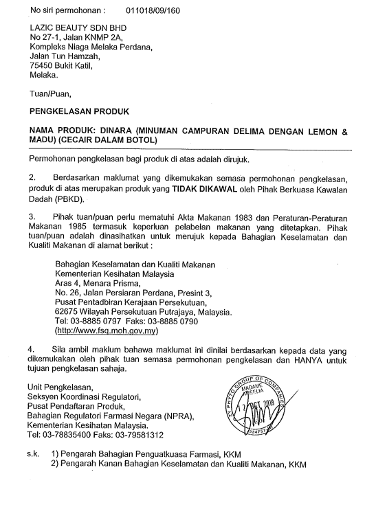 Dinara ini dirumus khas dengan bahan semulajadi dan tak de langsung bahan kimia yang terlarang. Dijamin selamat dengan Kelulusan KKM.  Alhamdullilah setakat ini memang tak ada feedback negatif dari pelanggan tentang sebarang masalah komplikasi semasa amalkan Dinara.